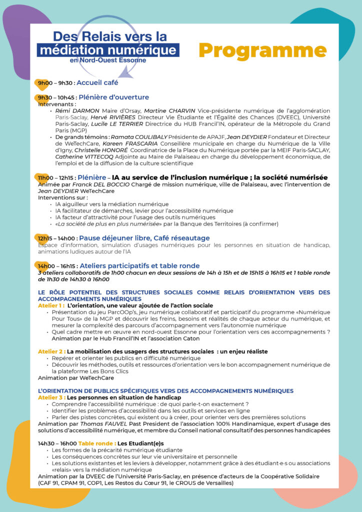 Cette journée d’accès gracieux, que nous organisons avec le soutien de l’ANCT dans le cadre de la feuille de route France Numérique Ensemble de l’Essonne, le Conseil départemental de l’Essonne, la MEIF Paris-Saclay, de l’Université Paris-Saclay, de collectivités et institutions locales, vise à renforcer les coopérations pour répondre au mieux aux sollicitations croissantes pour des aides aux usages des outils numériques ; les structures contribuant à l’action sociale et solidaire, en première ligne face à ces besoins, peuvent avoir un rôle clé pour orienter les publics en fragilité numérique vers les accompagnements les plus appropriés.